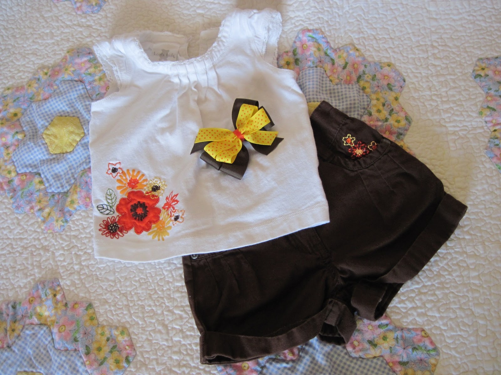 I told you all yesterday that I would post pics of the hairbows that I was going to make. I was so blessed to have a friend let me buy her gently used children's clothes. And here lately when I have purchased secondhand clothing for the girls, I have made hairbows to match. I have only bought 2 or 3 brand new outfits for them, so making the hairbows helps me add a little personal touch. These are not all the outfits that I got, but just a few of my favorites.